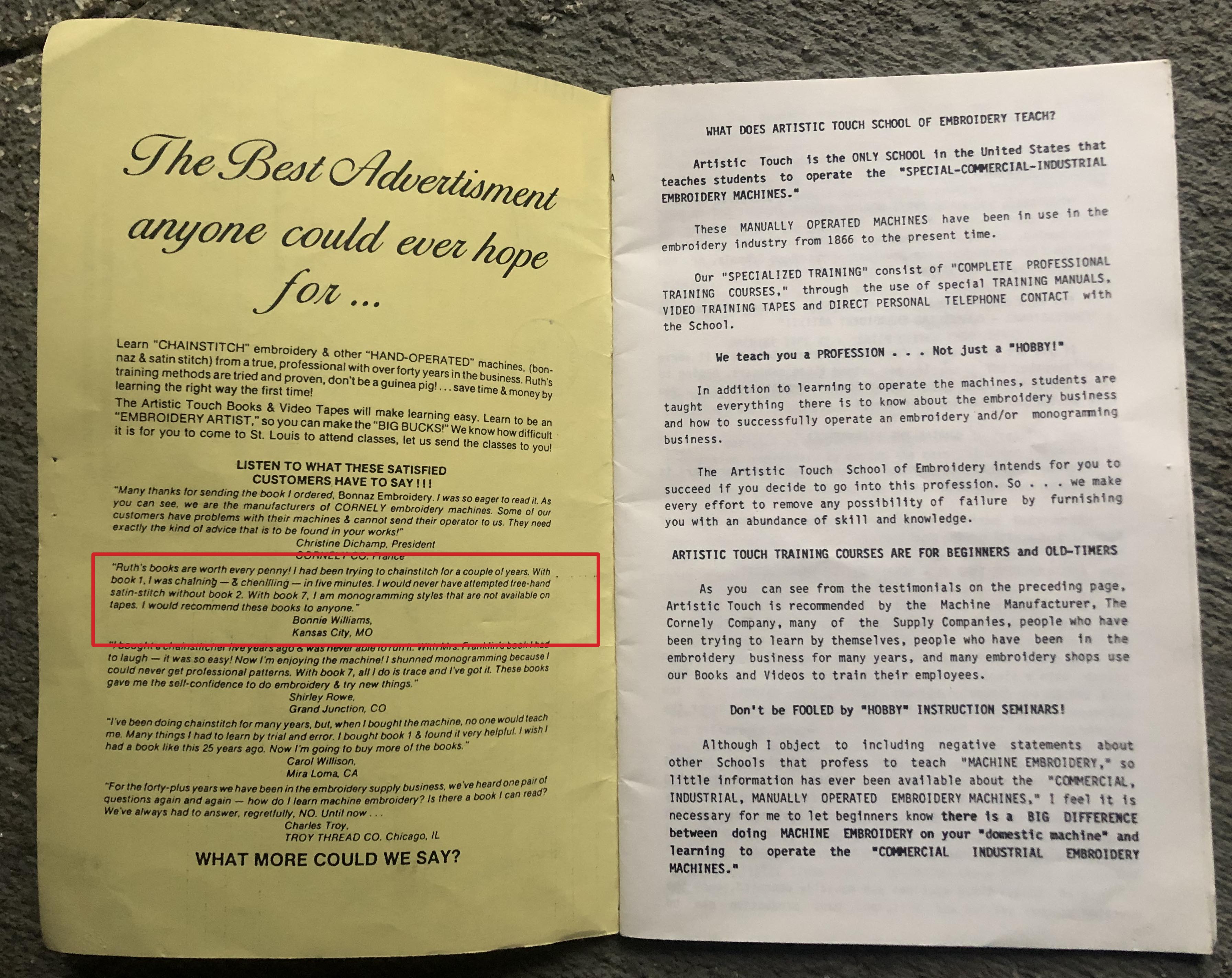 This site would not be possible without the generosity of Bonnie Williams and her 40 years of dedicated work in the embroidery industry. Bonnie met Ruth Franklin in 1979 and spent a week with Ruth at the Artistic Touch School of Embroider where she learnedd to operate the Singer 114w103 bonnaz machine under Ruth’s supervision. A full machine disassembly, hours of embroidering squares to learn how to get sharp corners, Ruth ensured that Bonnie became a highly skilled operator.