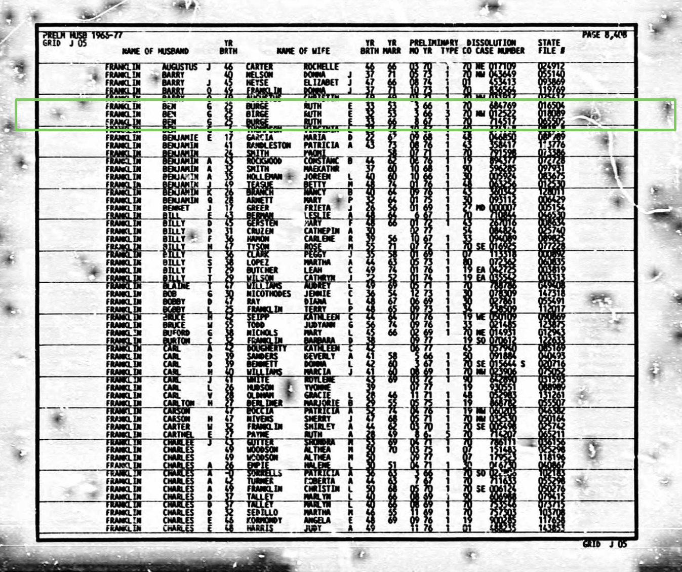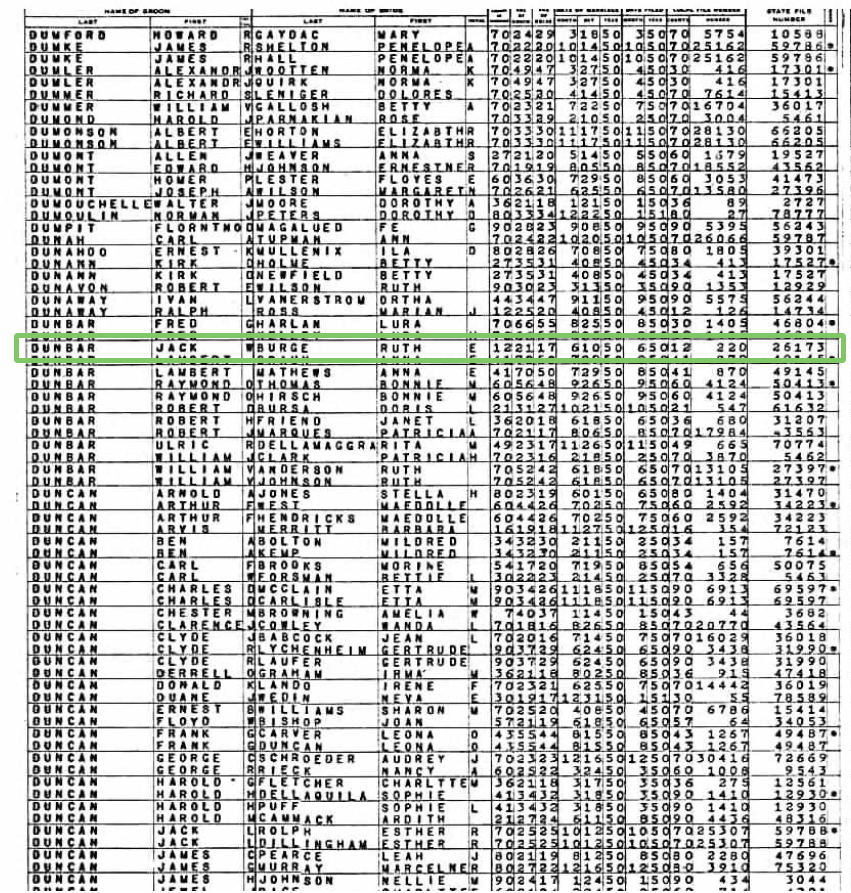 According to the 1949-1959 California Marriage Index, Ruth married Jack Dunbar on June 10, 1950, a few years before marrying Ben G. Franklin; no divorce record for Dunbar has been located. Los Angeles divorce records also show a marriage to Alexander Lavar Hill on January 14, 1950; the listed ages imply a 1931 birth year, likely a different Ruth E. Burge. The surnames “Hill” and “Davis” appear in Social Security files without corroborating documents so far.