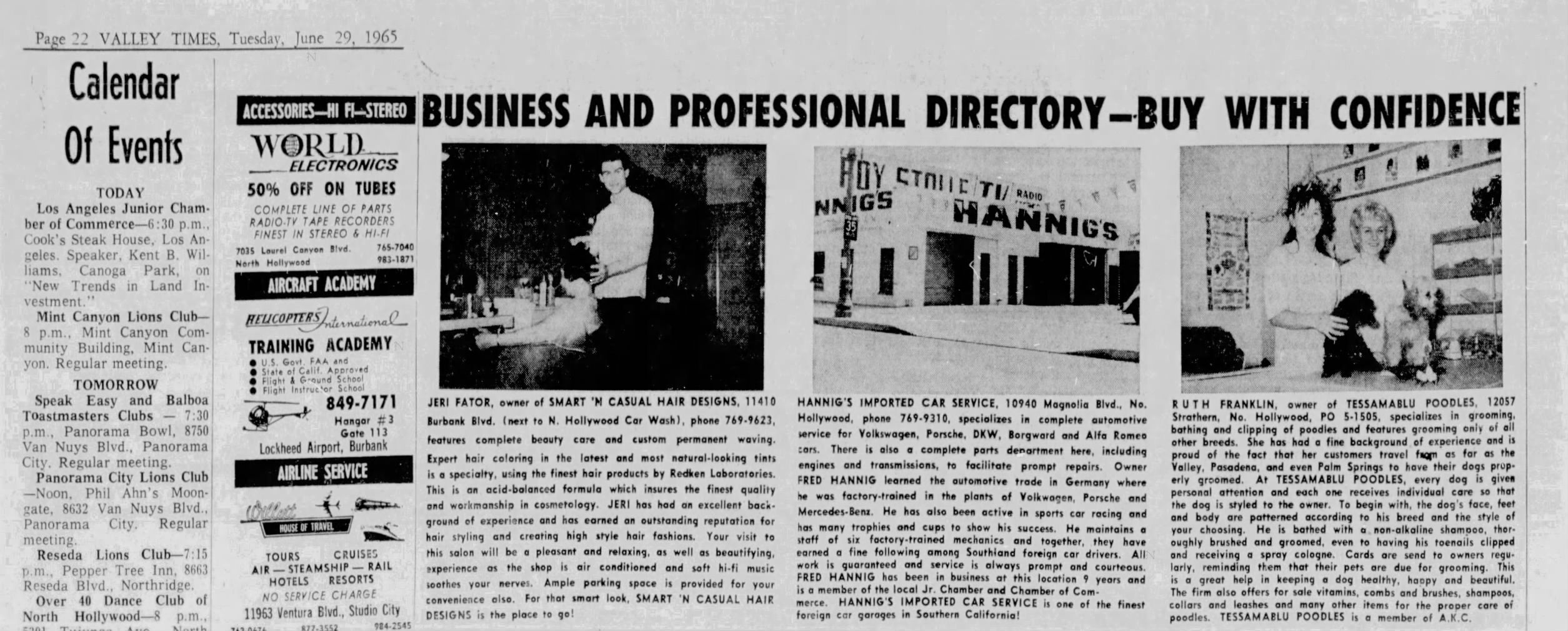 - 1965 — Operates “Tessamablu Poodles” (Van Nuys / North Hollywood).